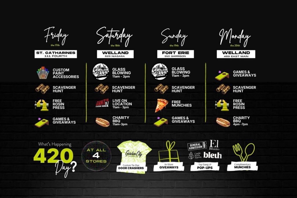 Garden City Cannabis Co. is hosting a four-day 420 weekend across four locations in Niagara, with events running in St. Catharines (111 Fourth Ave), Welland (623 Niagara St), Fort Erie (310 Garrison Rd), and Welland (469 East Main St) from Friday through Monday.